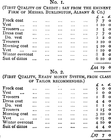 In this little book I have not attempted to lay down any fixed rule as to how much yearly one should spend on clothes. So much depends on the wearer, in the first place; secondly, on the stock of things one has in hand to start with; and thirdly, on the judicious selection of new material. I append, however, four tables of prices of clothes, of all descriptions required of tailors under ordinary circumstances; and the reader may elect to make what choice he likes. No. I shows top price charged by West-end tailors to West-end swells on the credit system. No. 2 shows same quality on the ready money system, or, much the same thing, three months’ credit. No. 3 gives second quality, and second-rate work, for cash; and No. 4 is slop-shop price, ready made and ticketed in window.